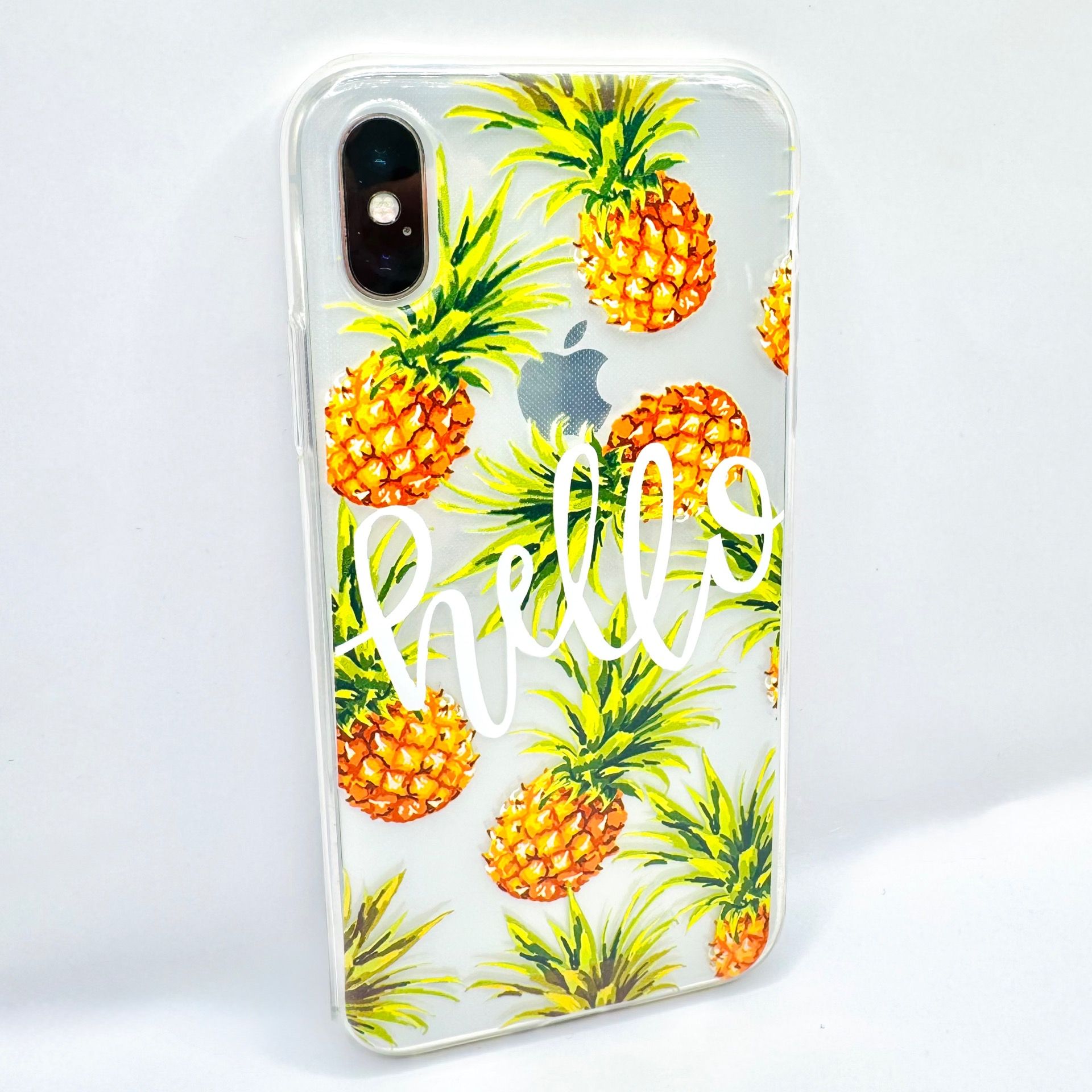 Apportez une touche de soleil à votre iPhone X/XS avec cette coque transparente ornée de jolis ananas 🍍 et du mot « hello » en typographie blanche moderne.