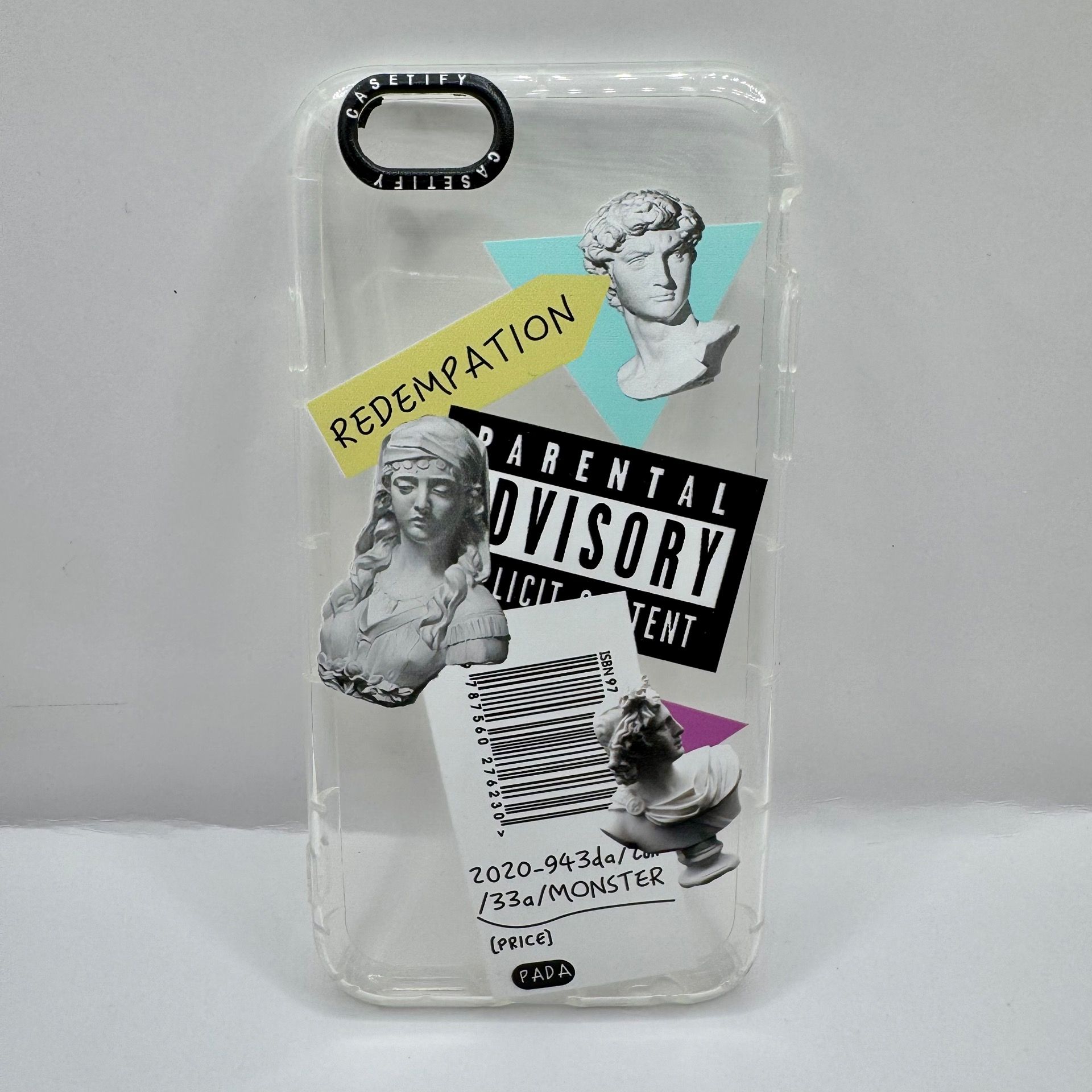 Elle combine des illustrations de statues antiques, un sticker “Parental Advisory” et des éléments graphiques modernes pour un style original et urbain.